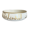matte wite chocolate bowl decorated with the phrase ”allahumma barik hatha Al-bayt” in cold gold 35 cm in diameter