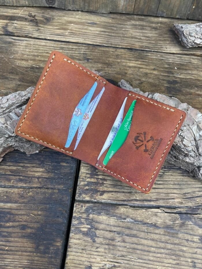 جميع المنتجات مثل المحافظ مصنوعة بالكامل من الجلد البقري الطبيعي حتى حشوات الجيوب جلد طبيعي والخياطة خياطة يدوية وصناعة يدوية والخيطان خيطان بوليستر مشبعة بالواكس وما بتنقطع او بتنسل