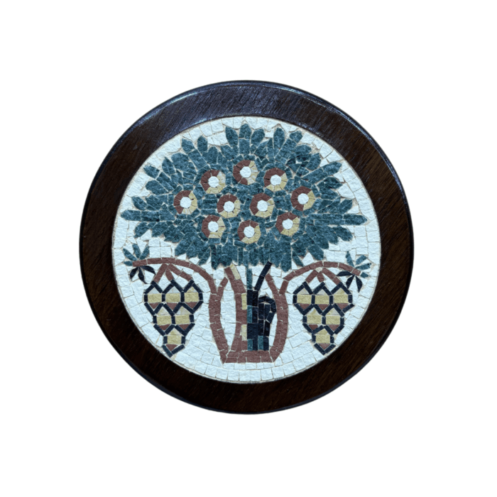 The “Madaba Tree” mosaic is inspired by the ancient mosaic art techniques of Madaba, Jordan. The design symbolizes life and abundance, featuring the iconic “Madaba Tree” surrounded by two grape clusters, representing fertility and prosperity in local culture. The mosaic also includes ten engravings inspired by the Ten Commandments, reflecting spiritual and moral values. Handmade with precision from colorful stone tiles, the piece measures 15 cm × 15 cm without the frame, 18 cm × 18 cm with the frame, and is 1 cm thick. Due to its handmade nature, slight variations in details may occur, but the colors and design match the displayed product.
