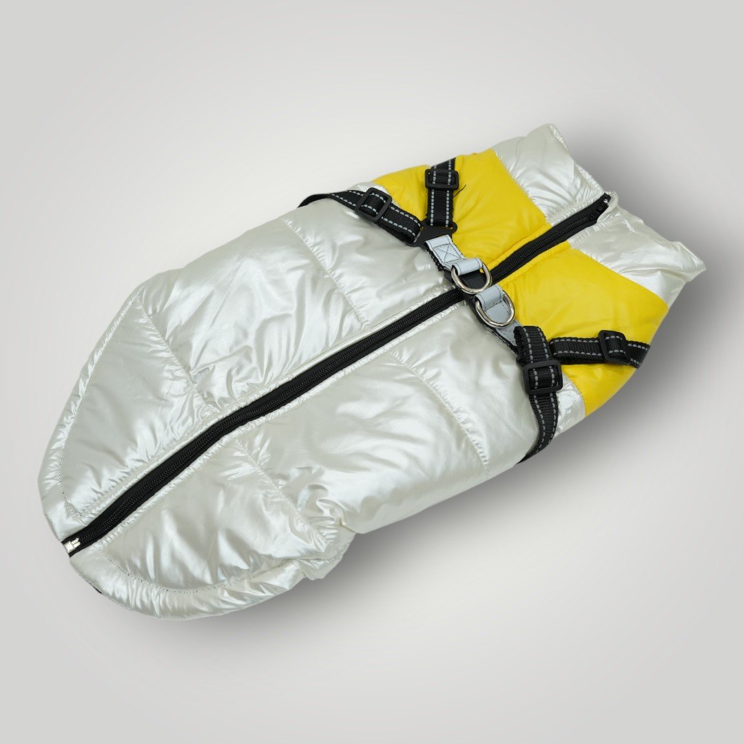 This glossy silver jacket with a bright yellow stripe ensures warmth and visibility for your pet. Featuring a built-in harness, it’s perfect for safe and stylish walks.