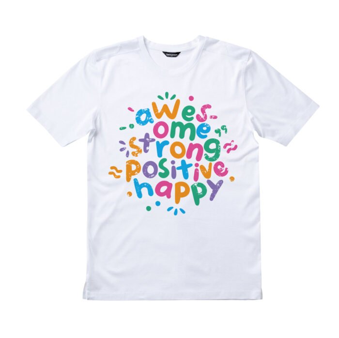 T-shirt in White color designed with words “awesome strong positive happy”.